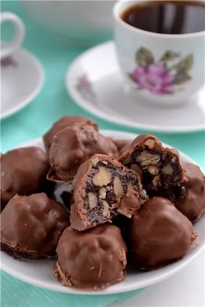 ШАГ 6 Положить ореховые шарики в шоколад. Затем вытащить в тарелку. Можно обвалять их в шоколадной или кокосовой стружке, в цветной посыпке — фантазии нет предела. При желании поставить в холодильник.