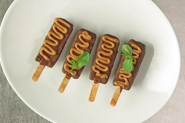 ШАГ 3 Растопить шоколад на водяной бане, таким же образом растопить какао масло и смешать их. Достать замороженную массу из формочек, покрыть глазурью. украсить вареной сгущенкой и листочком мяты.