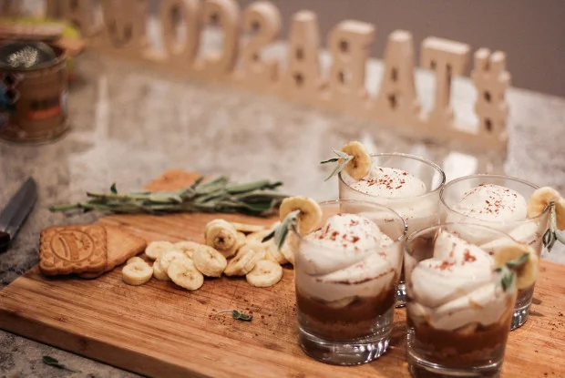 Вареное сгущенное молоко Печенье Бананы Жирные сливки Сливочное масло Кофейный ликер Сахарная пудра TABASCO® Хабанеро Какао-порошок Темный шоколад Выпечка и десерты Горячие закуски