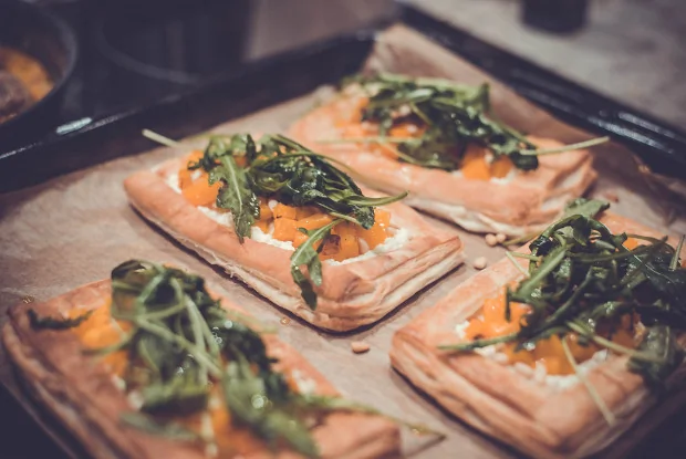 Открытый пряный пирог с тыквой и зеленым соусом табаско