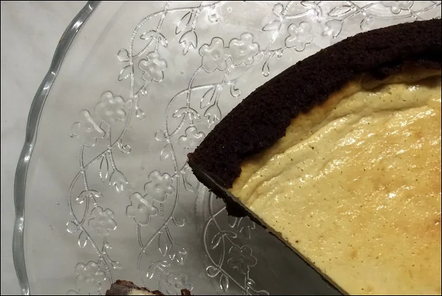 ШАГ 2 Растопить в микроволновой печи или на водяной бане оставшийся шоколад и смешать его с доведенными до кипения сливками. Влить половину кофе. Перемешать ингредиенты до однородного цвета и фактуры. Перелить полученный ганаш в основу чизкейка.