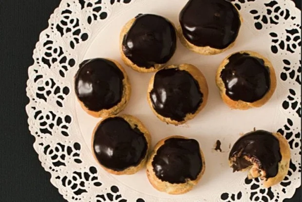 ШАГ 13 Из сливок и шоколада приготовить ганаш: вскипятить 150 миллилитров сливок и влить их в 150 грамм шоколада кусочками. Подождать две минуты и перемешать венчиком центробежными круговыми движениями. Когда смесь станет гладкой, блестящей и однородной, ганаш готов. Окунуть в него каждое шу, выложить на противень и поставить в холодильник.