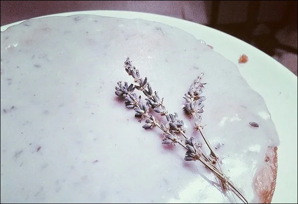 ШАГ 11 Вторую половину глазури смешиваем с цветками лаванды, ставим опять на огонь, доводим до легкого кипения и на медленном огне провариваем 1-2 минуты. Таким образом, сироп должен немного загустеть. Только будьте осторожны, чтобы сироп не сгорел. Добавляем оставшуюся сахарную пудру, замешиваем до густоты, и затем, заливаем им полностью сверху кекс. Во вторую глазурь можно добавить немного сиреневого пищевого красителя.