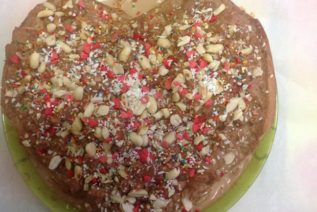 ШАГ 7 Сверху посыпать орехами. Для красоты я еще присыпала кокосовой стружкой и цветными шариками.