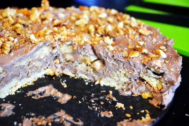 ШАГ 4 В круглую разъемную форму для выпечки на дно выложите печенье, половину сливочно-кофейного крема, посыпьте частью измельчённых грецких орехов, выложите второй слой печенья, выложите оставшийся крем, посыпьте второй частью орехов и крошками от печенья, накройте крышкой, тарелкой или пищевой пленкой и уберите на ночь в холодильник.