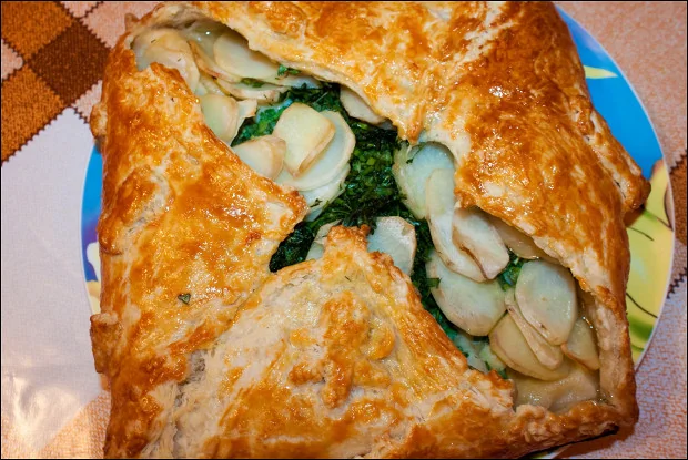 Захотелось порадовать своих домашних каким-то интересненьким пирогом. Как раз хотела попробовать слоёное тесто новой марки. Так же давно хотелось чтего-то рыбного. ВОт так и родился данный необычный рецепт.