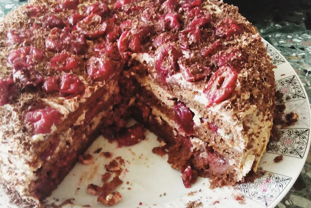 Разрыхлитель Куриное яйцо Сахар Сгущенное молоко Пшеничная мука Сметана Какао Сливочное масло Замороженная вишня Ваниль Выпечка и десерты Шоколадный торт
