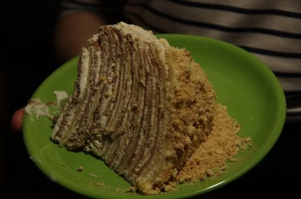 Когда все блины смазаны тем же кремом смазать верх и бока.
