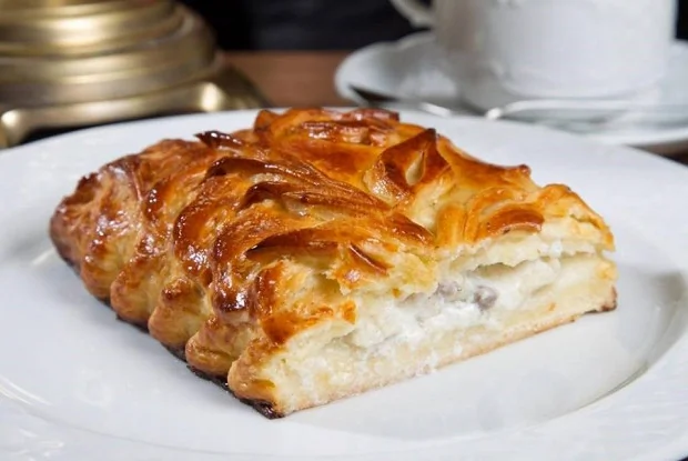 ШАГ 8 Выложить начинку на корж, накрыть вторым коржом, соединить края и поставить в духовку.