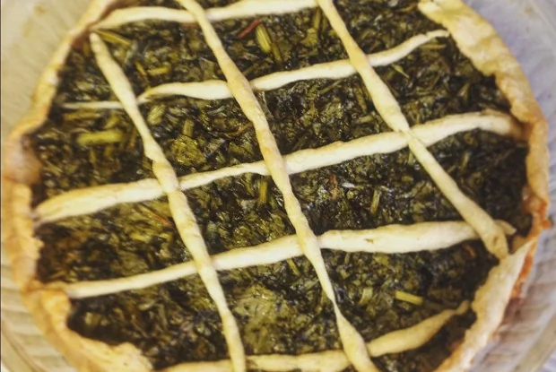 ШАГ 3 Раскатываем тесто в форму. Выклалываем щавель. Сверху для красоты можно сделать сетку из теста, а можно оставить пирог открытым.
