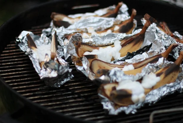 ШАГ 2 Кладем банан на гриль и запекаем, пока на зефире не появится румяная корочка.