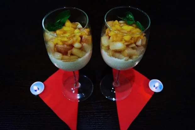 ШАГ 7 Персики выложить поверх сливочного слоя, украсить мятой и подавать на стол.
