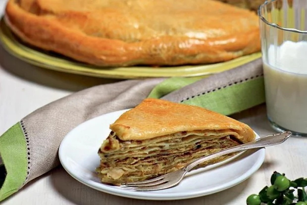 ШАГ 5 Отделите треть теста, оставшееся раскатайте в лепешку тол- щиной 1–1,5 см, застелите круглую глубокую форму, чтобы края свисали. На тесто выложите часть риса, на него блин; потом лук, на него блин; потом грибы — и опять блин; потом цесарка. И так, пока не закончатся продукты. Последним слоем должна быть цесарка. Ее нужно полить соусом.
