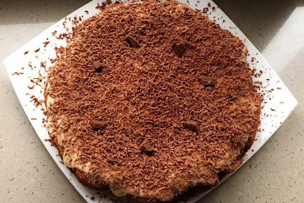 ШАГ 15 Сверху украшаем его ранее отложенным в мисочку кремом и тертым шоколадом.