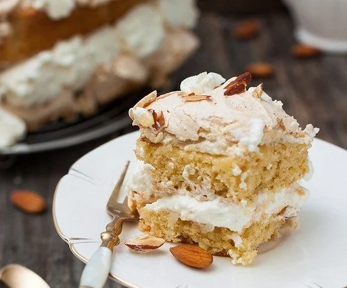 ШАГ 6 Посыпать меренгу дробленым не жареным миндалем или миндальными лепестками и выпекать при 175 градусов 30 минут. Меренга должна зазолотиться и стать твердой снаружи.