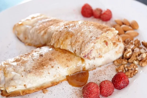 ШАГ 3 Выложить начинку в 2 слоя (снизу творог, сверху натёртые яблоки).
