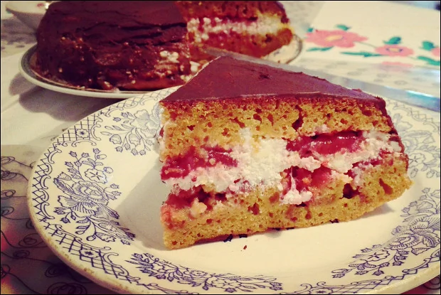 ШАГ 5 Готовый корж разделите на две части. Выложите творожную прослойку на нижний корж и накройте вторым сверху.