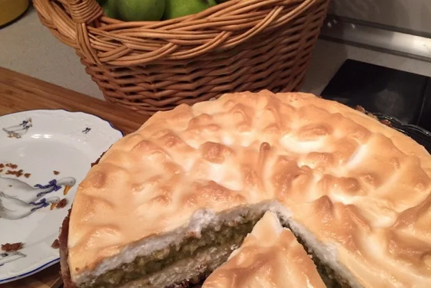 ШАГ 4 Для меренги растворить 175 г сахара в 75 мл воды и сварить сироп до полного растворения сахара. Взбить белки 3-х яиц. Продолжая взбивать, влить тонкой струйкой сироп. Выложить на начинку меренгу и выпекать в духовке до зарумянивания, 20 минут при 200 градусах.