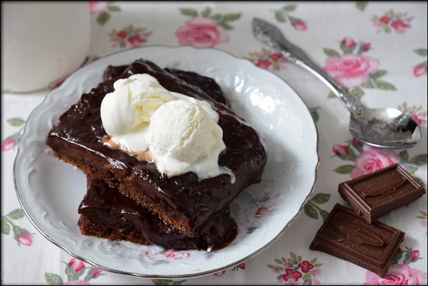 ШАГ 3 Растворить оставшиеся сахар и какао в 450 мл кипятка, осторожно влить в форму. Выпекать 25-30 минут — пудинги должны подняться и стать плотными. Подавать сразу, пока десерт не остыл.