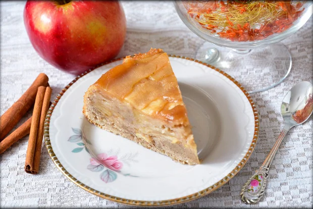 ШАГ 2 Слегка смазать сливочным маслом глубокую круглую форму объёмом 1,5 л. Очистить и тонко нарезать яблоки, удалив сердцевину. Выложить в форму и посыпать тростниковым сахаром. Покрыть тестом.