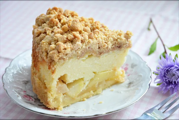 ШАГ 3 Яблоки, очистив от кожуры и семян, нарезать тонкими дольками. Сбрызнуть лимонным соком и перемешать, чтобы они не потемнели. Оставшиеся яйца разделить на белки и желтки. Тщательно растереть творог с оставшимся сахаром и 5 желтками, подмешать манку. Белки взбить и осторожно ввести в творожную массу. На тесте разложить яблоки, выложить и разровнять творожную массу. Тесто с корицей раскатать и посечь с 2 стол. ложками муки. Посыпать пирог получившейся крошкой и выпекать 60 мин.