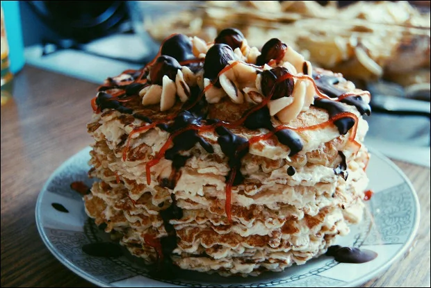 ШАГ 6 Намазать каждую вафлю кремом и сформировать торт. Можно украсить орехами и топпингом.