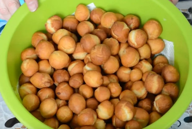 ШАГ 2 Брать столовой ложкой без горки и сталкивать другой ложкой в разогретый фритюр и выпекать.