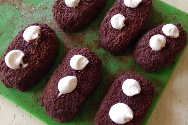 ШАГ 8 Из полученной массы сформировать пирожные (у меня вышло 10 шт), сверху припорошить какао-порошком, и с помощью кондитерского мешка осадить по 2 капли творожного крема.