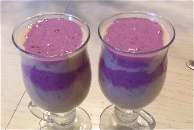 ШАГ 4 Разделить полученную смесь на 2 части — в одну добавить арахисовую пасту, в другую — ягоды (любые, у меня была ежевика), обе смеси по отдельности ещё раз пробить блендером до однородности.