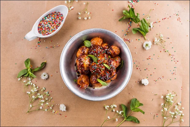 ШАГ 8 Готовые пончики выложить на тарелку, полить белым и темным шоколадным соусом. Украсить мятой и кондитерской посыпкой.