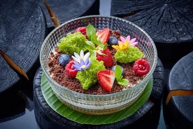 ШАГ 4 Украшаем шоколадным крамболом, свежей клубникой, голубикой, клубничным соусом, бисквитом «спонж», веточкой свежей мяты и цветами из мастики.
