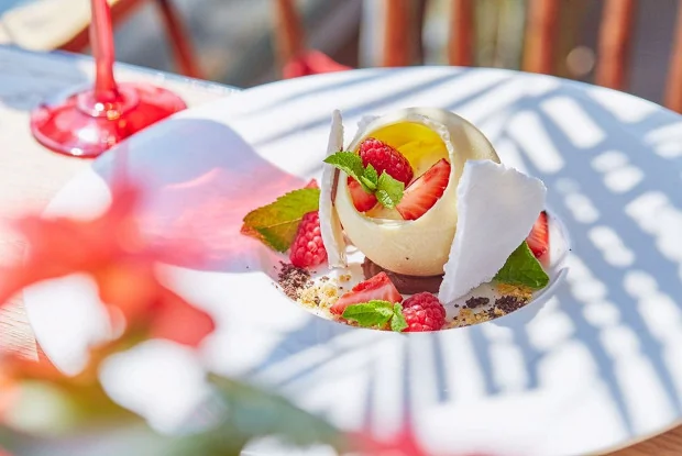 Куриное яйцо Сахар Сливки Миндаль Белый шоколад Масло какао Клубника Малина Мята главная Выпечка и десерты Французская кухня