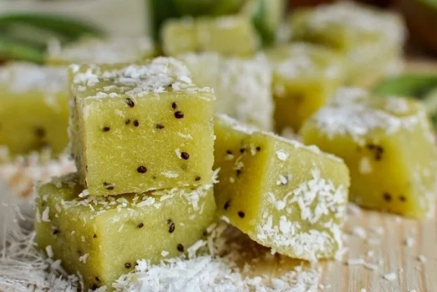 ШАГ 6 Оставить массу для застывания на 3-4 часа, после чего аккуратно извлечь, нарезать на кубики и обсыпать кокосовой стружкой.