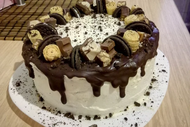 ШАГ 6 Тортик практически готов, остался только декор. Я украшала торт печеньем орео, киндер шоколадом, батончиками с орехами, вафельными трубочками. Можно использовать любые сладости, центр тортика можно тоже украсить чем захотите.