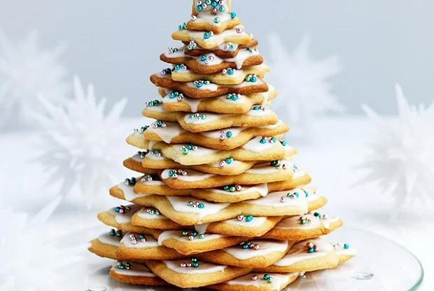 ШАГ 7 Приготовь глазурь (возьми 2 пакетика готовой глазури), промажь остывшее печенье и собери ёлку.