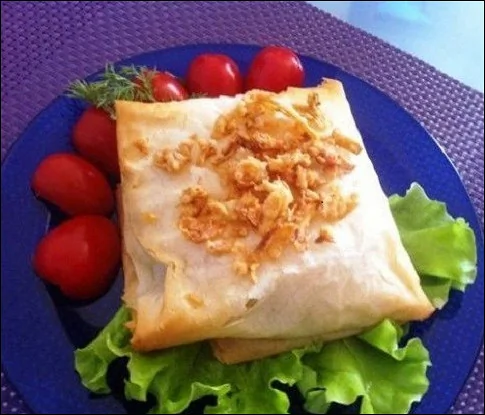 ШАГ 2 На 2 листа теста выложить внахлест треску, лосось и перец (предварительно запеченный).