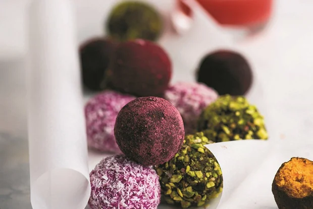 ШАГ 4 Обвалять трюфели в какао, молотых фисташках, свекольной пудре или кокосовой стружке.