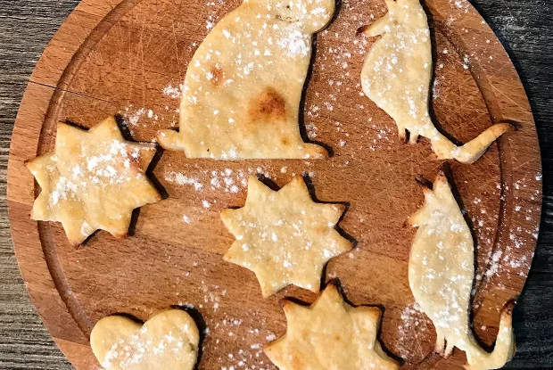 ШАГ 5 Готовое тесто раскатать толщиной 3 мм, формочками вырезать печенье и уложить на противень.