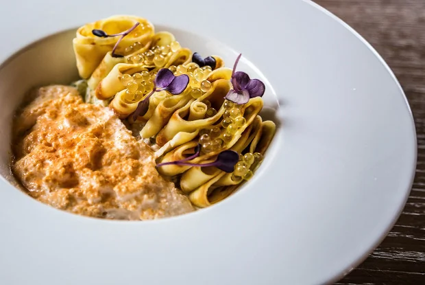 ШАГ 6 На тарелку выложить подготовленный тартар из лосося, яблока и огурца, сверху блинчики, на них икру дикого лосося и рядом через кондитерский мешок выложить мусс.