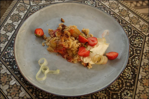 ШАГ 3 Уложить ревень с клубникой в форму. Посыпать крошкой. Сверху посыпать столовой ложкой сахара для карамельной корочки. Выпекать 25 минут в духовке.