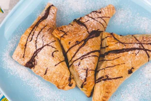 ШАГ 1 Взять готовое слоеное тесто и разделить его на девять квадратиков. Каждый квадрат заполнить одной чайной ложкой нутеллы. Закрыть треугольником и придавить вилкой по краям.