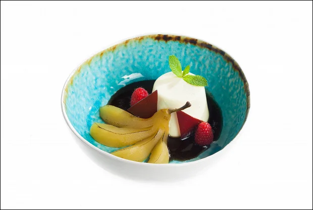 Панна-котта с оливковой карамелью и грушей в сиропе