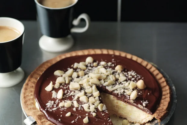 ШАГ 8 Аккуратно покрыть ганашем замороженную начинку пая, разравнивая обратной стороной ложки. Посыпать орехами макадамия. Убрать в холодильник примерно на 20 минут, чтобы ганаш застыл. Подавать холодным.