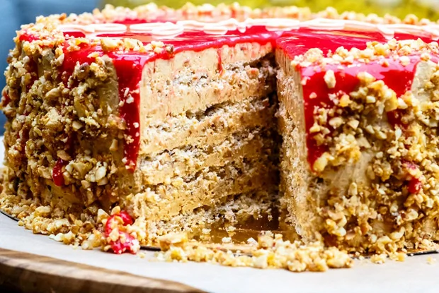 Жареный фундук Сахар Яичный белок Сливочное масло Вареное сгущенное молоко Фундуковая паста Белый шоколад Кондитерский гель Красный пищевой краситель Коньяк главная Выпечка и десерты Русская кухня Торты