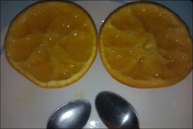 ШАГ 1 Разрезать апельсины пополам, извлечь мякоть ложкой. Чтобы не повредить корку.