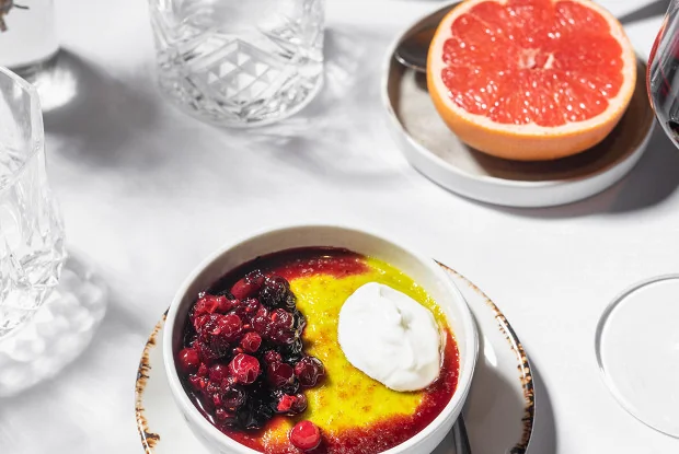 ШАГ 3 Сверху выложить с одной стороны варенье из лесных ягод, с другой — столовую ложку греческого йогурта.