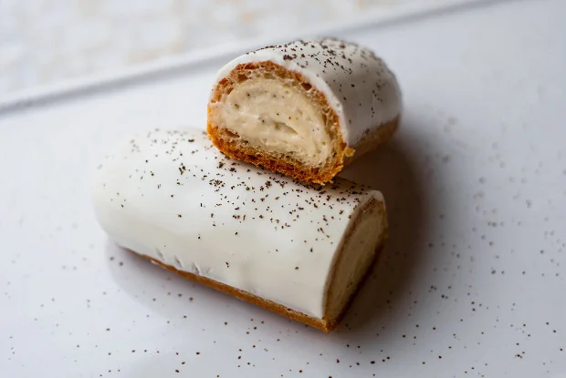 ШАГ 16 Проколоть донышки эклеров в трех местах. Наполнить эклер кремом, начиная с краев. Украсить по вкусу.
