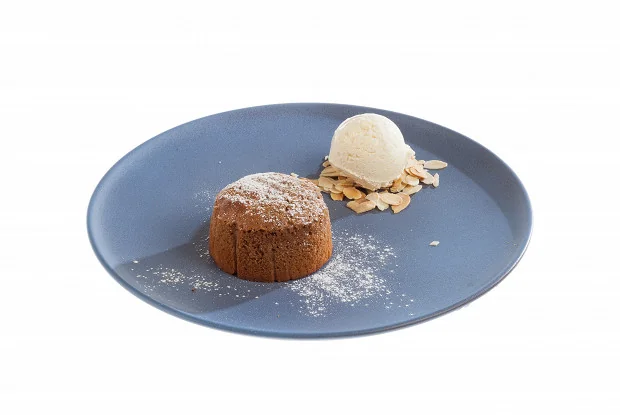 ШАГ 7 На тарелку выложить готовый фондан, присыпать его сахарной пудрой. Рядом высыпать немного миндальных лепестков, а на них положить шарик мороженого.