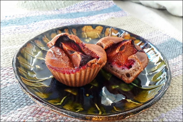 ШАГ 5 Сливы разрезать на четыре дольки, в каждую формочку положить по четвертинке и немного притопить в тесте.