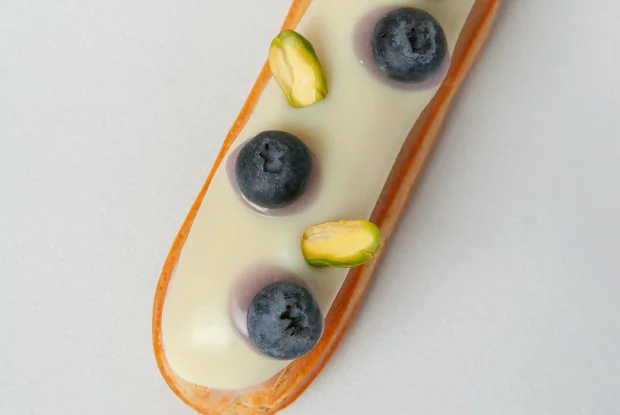 ШАГ 13 Одну сторону готового эклера обмакнуть в растопленный белый или горький шоколад, пока шоколад не застыл, украсить его свежей голубикой и фисташками.